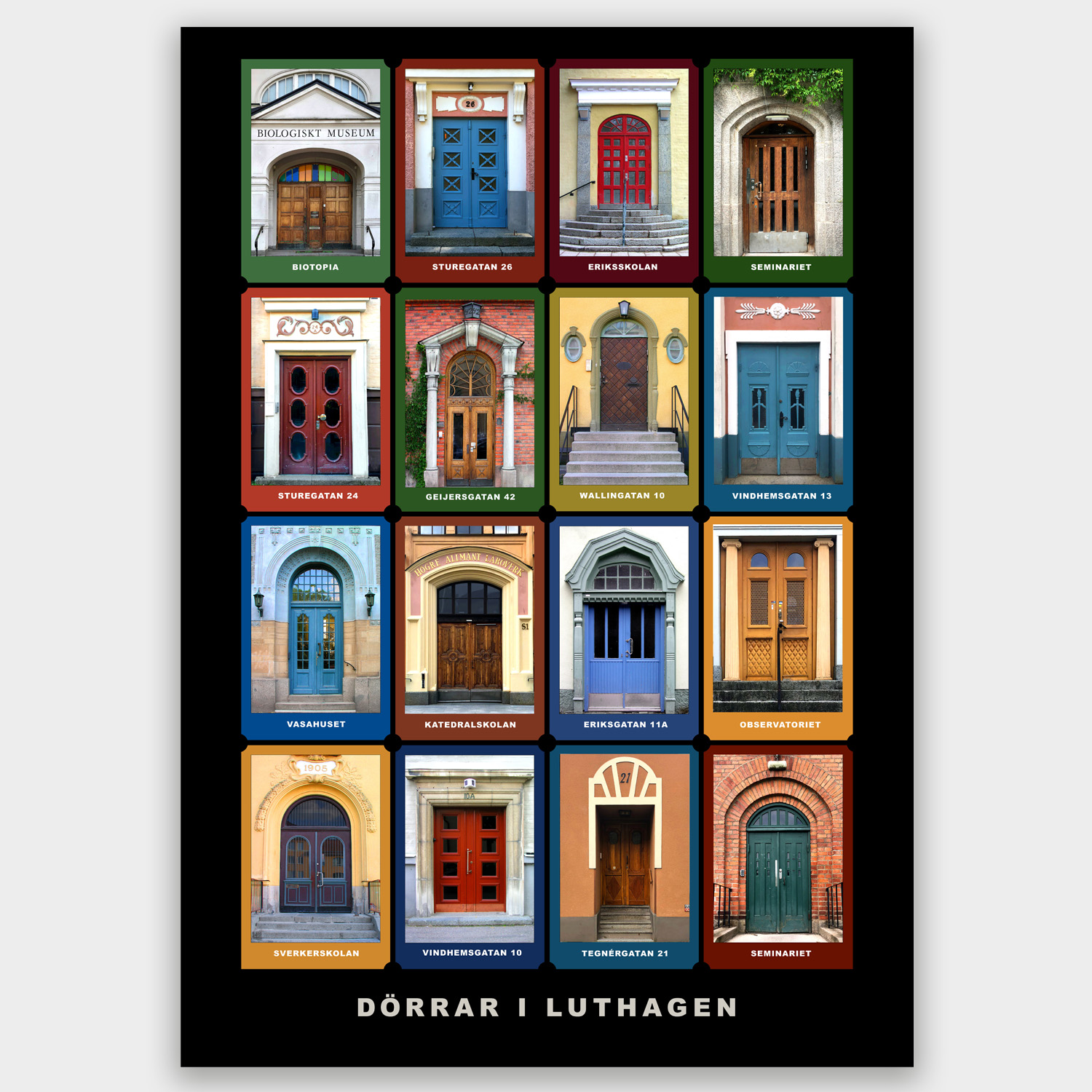 Ett vykort i A5-format med vackra dörrar i Luthagen, Uppsala. En perfekt souvenir från Uppsala att ha på kylskåpet. Följande dörrar ingår: Biotopia, Sturegatan 26, Eriksskolan, Seminariet, Sturegatan 24, Geijersgatan 42, Wallingatan 10, Vindhemsgatan 13, Vasahuset, Katedralskolan, Eriksgatan 11A, Observatoriet, Sverkerskolan, Vindhemsgatan 10, Tegnérgatan 21, Seminariet.