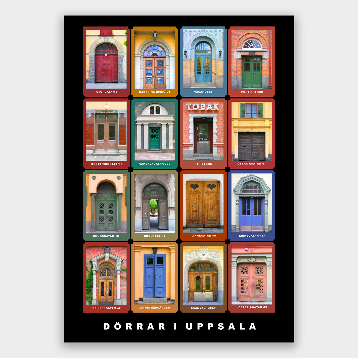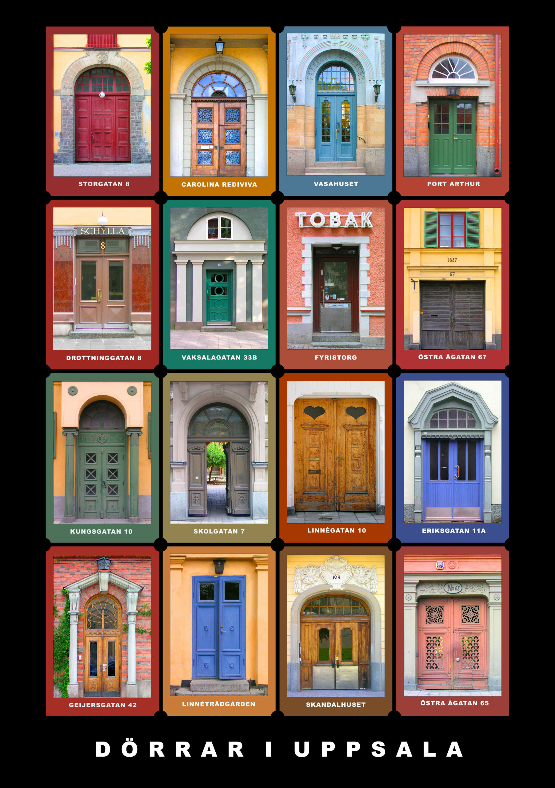 Ett vykort i A5-format med vackra dörrar i Uppsala. Följande dörrar ingår: Storgatan 8, Carolina Rediviva, Vasahuset, Port Arthur, Drottninggatan 8, Vaksalagatan 33, Fyristorg, Östra Ågatan 67, Kungsgatan 10, Skolgatan 7, Linnégatan 10, Eriksgatan 11, Geijersgatan 42, Linnéträdgården, Skandalhuset, Östra Ågatan 65″