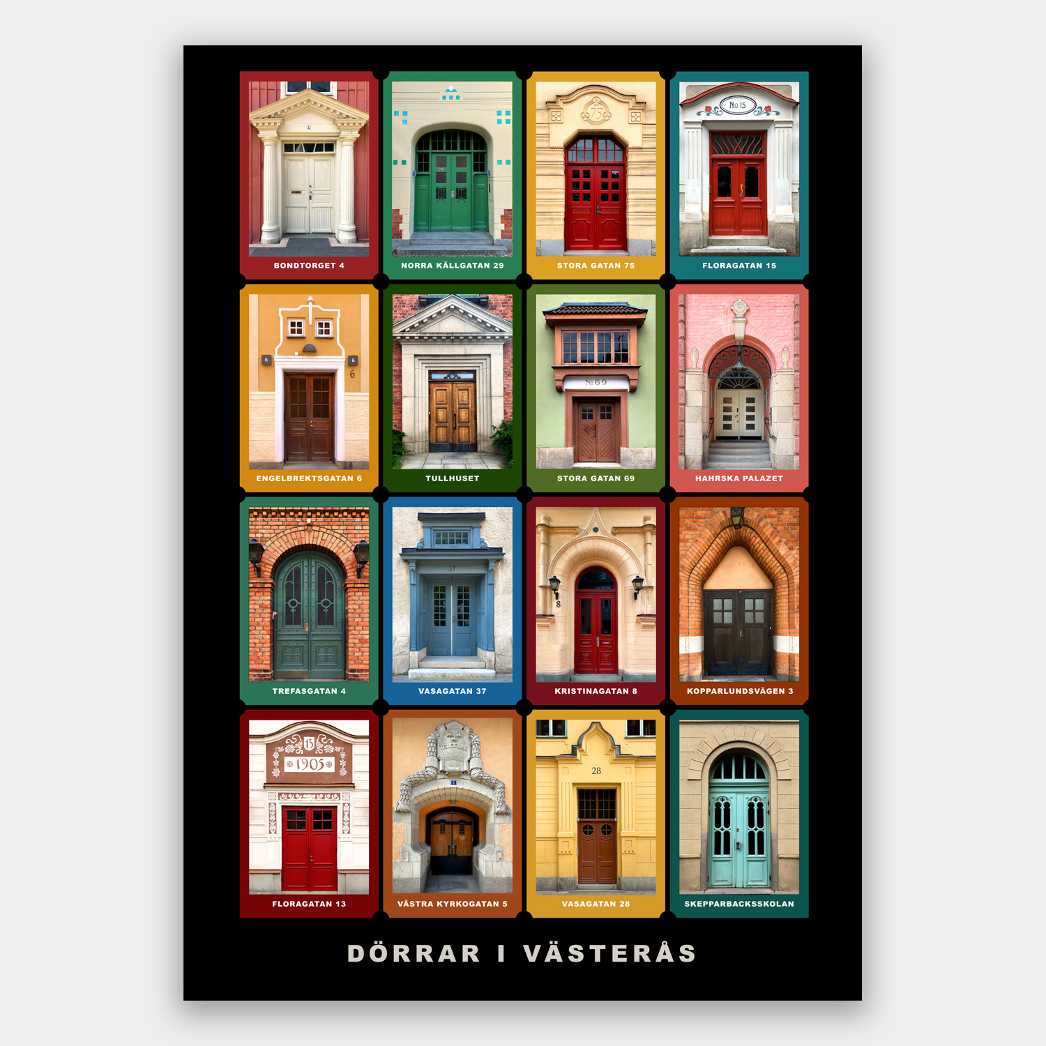Ett vykort i A5-format med vackra dörrar i Västerås. Fotograferat sommaren 2021. Följande dörrar ingår: Bondtorget 4, Norra Källgatan 29, Stora Gatan 75, Engelbrektsgatan 6, Tullhuset, Stora Gatan 69, Hahrska Palazet, Trefasgatan 4, Vasagatan 37, Kristinagatan 8, Kopparlundsvägen 3, Floragatan 13, Västra Kyrkogatan 5, Vasagatan 28, Skepparbacksskolan