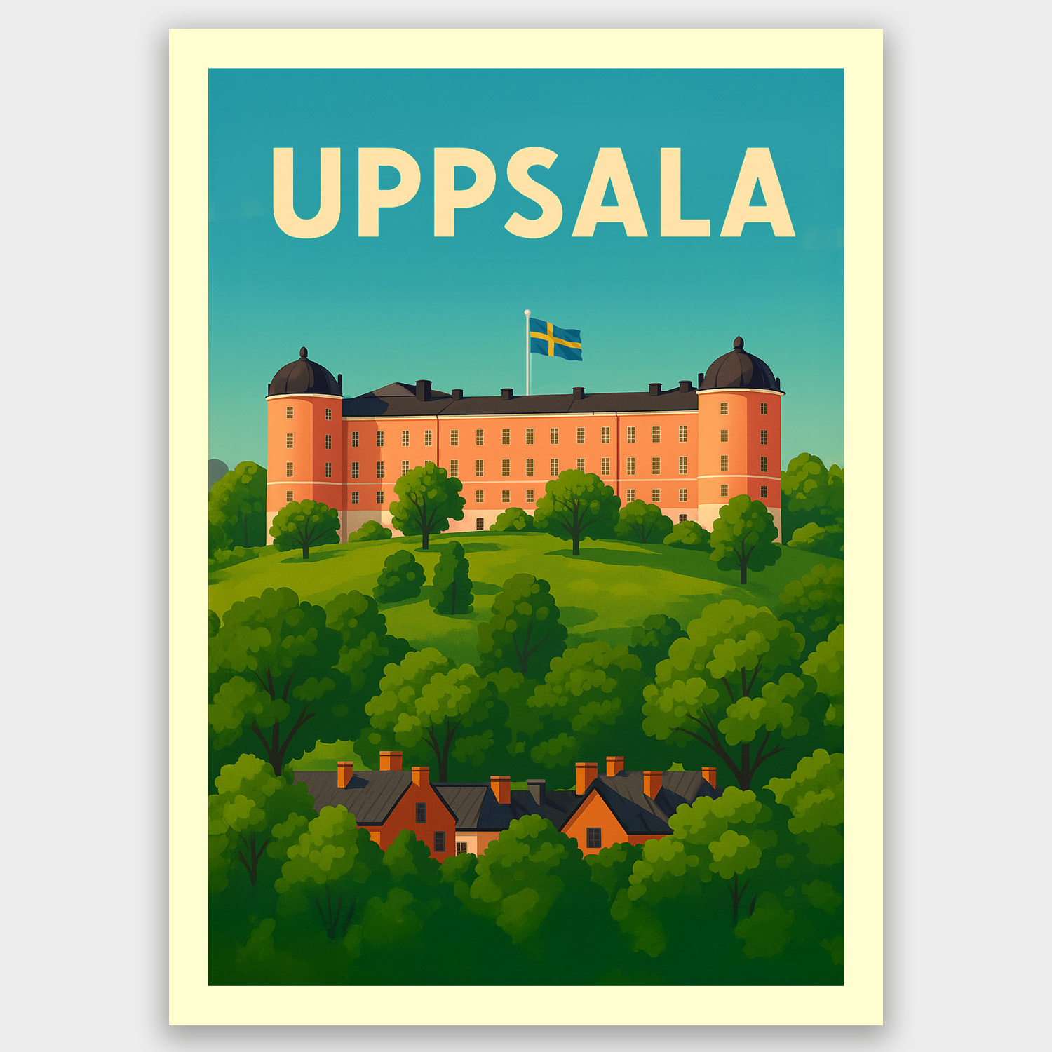 Ett vykort i A6-format med Uppsala Slott med en vajande svensk flagga. En perfekt souvenir från Uppsala att ha på kylskåpet.